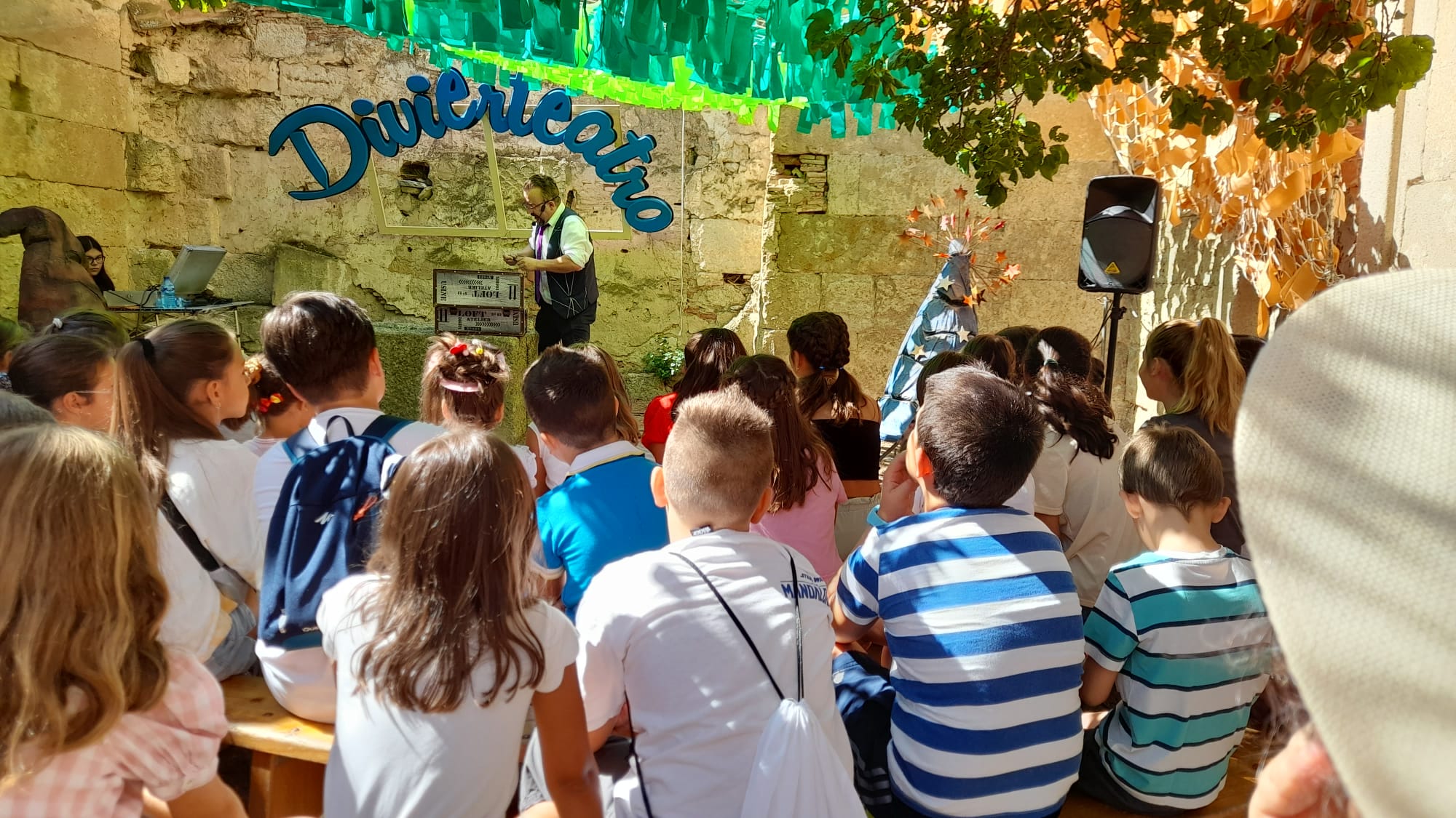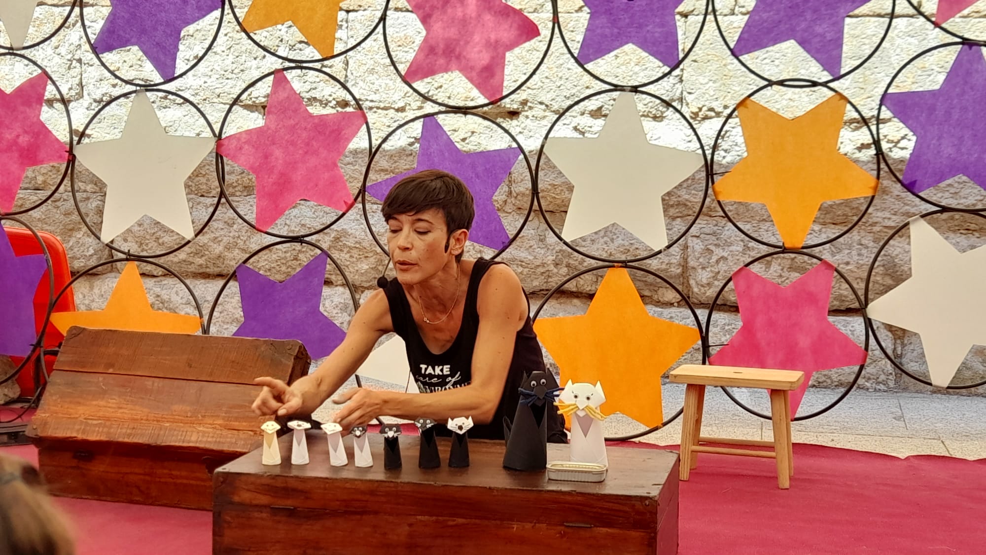 Seguimos después estando a nuestra manera de estar en Ciudad Rodrigo este 2022 y fuimos a Divierteatro y pudimos acompañar a Denis Rafter en el palacio de Montarco: cuando llegamos empezaba un cuentacuentos basado en su «Elio y EloÃsa» para niños del pueblo vecino de Sancti EspÃritus y en el que lo principal no era tanto lo que contaba sino cómo lo contaba, cómo lograba la atención de los peques y hacerles partÃcipes del rito teatral. Afuera, en la plaza del Conde, talleres y otras actividades de Divierteatro vestÃan la calle de jaleo y pudimos adentrarnos entre infantes para disfrutar del trabajo de Pilar Borrego (Katua&Galea) con su historia de gatos, limpito y delicado como siempre. Un placer acompañarla y una suerte tenerla siempre disponible porque nos dio algunas pistas chulas para seguir Divierteatro al dÃa siguiente.