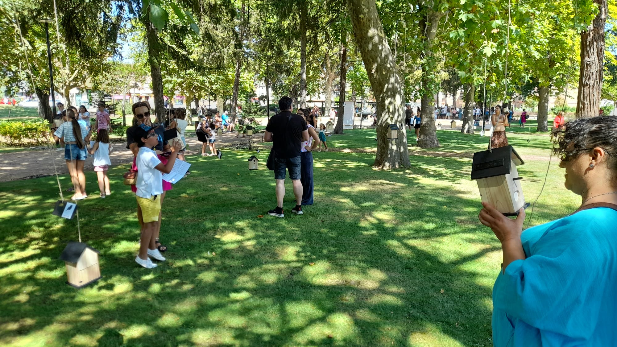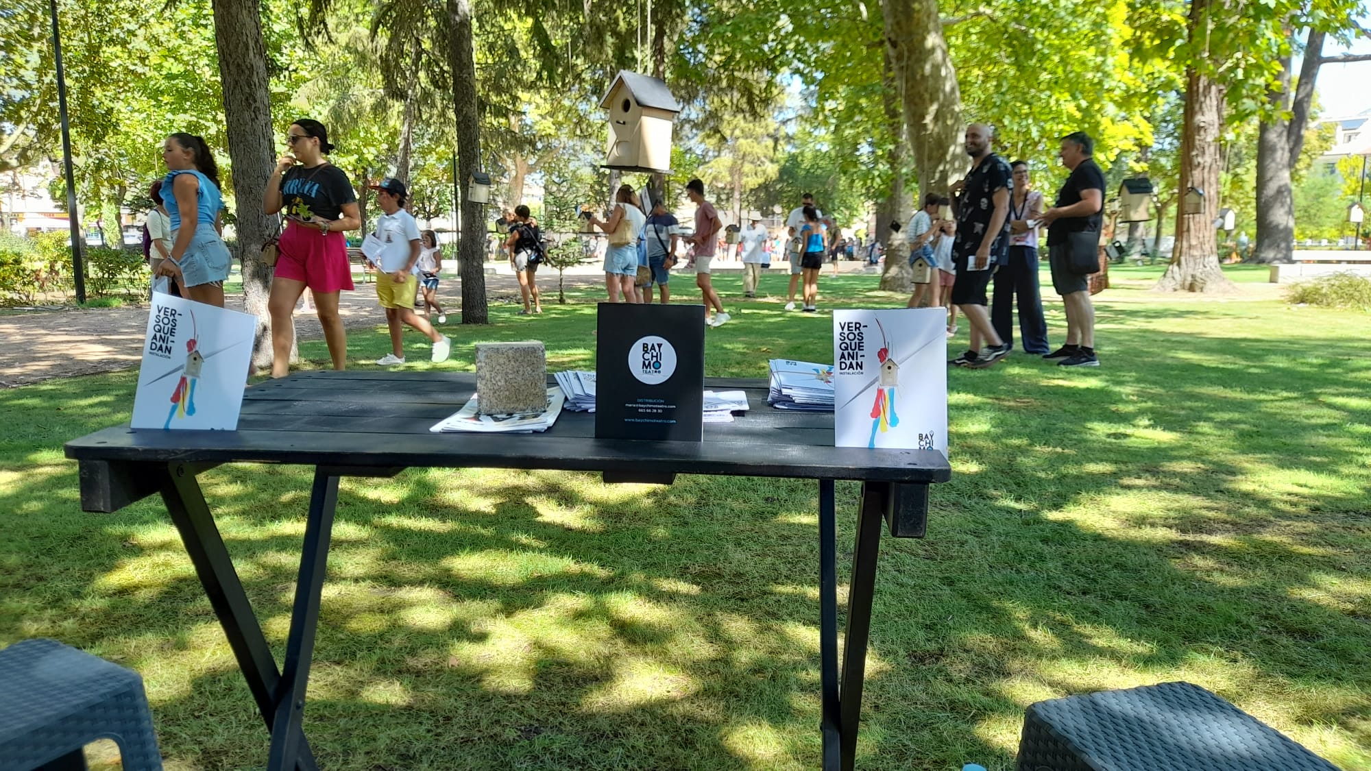 El miércoles fuimos al parque La Florida para disfrutar del que sin duda ha sido uno de los hitos de esta feria, la instalación poética de Baychimo Teatro «Versos que anidan» y en la que las palabras se incorporaban a la escena individual que las casetas nido, alimentadas con una plaquita solar, creaban para el espectador/oyente de poemas de autores (plumas) como Alejandra Pizarnik, Gloria Fuertes, Gianni Rodari, Beatriz Osés, Raúl Vacas, MarÃa Elena Walsh, Oliveiro Girondo o León Felipe en la voz (canto) de intérpretes como Elena Muñoz, Paloma Leal, Ramón EnrÃquez, Ana Roncero o Antonio Velasco… un juego que invita al descubrimiento y que provoca la imaginación, un encuentro entre literatura, teatro, artes plásticas y naturaleza que es también lugar de reunión para espectadores, vecinos y artistas donde intercambiar visiones de la poesÃa, entendida esta en un sentido amplio. Una instalación que nació del primer festival PoetiZa y que bien puede alimentar ferias del libro y otros festivales literarios. Hay que contarlo.