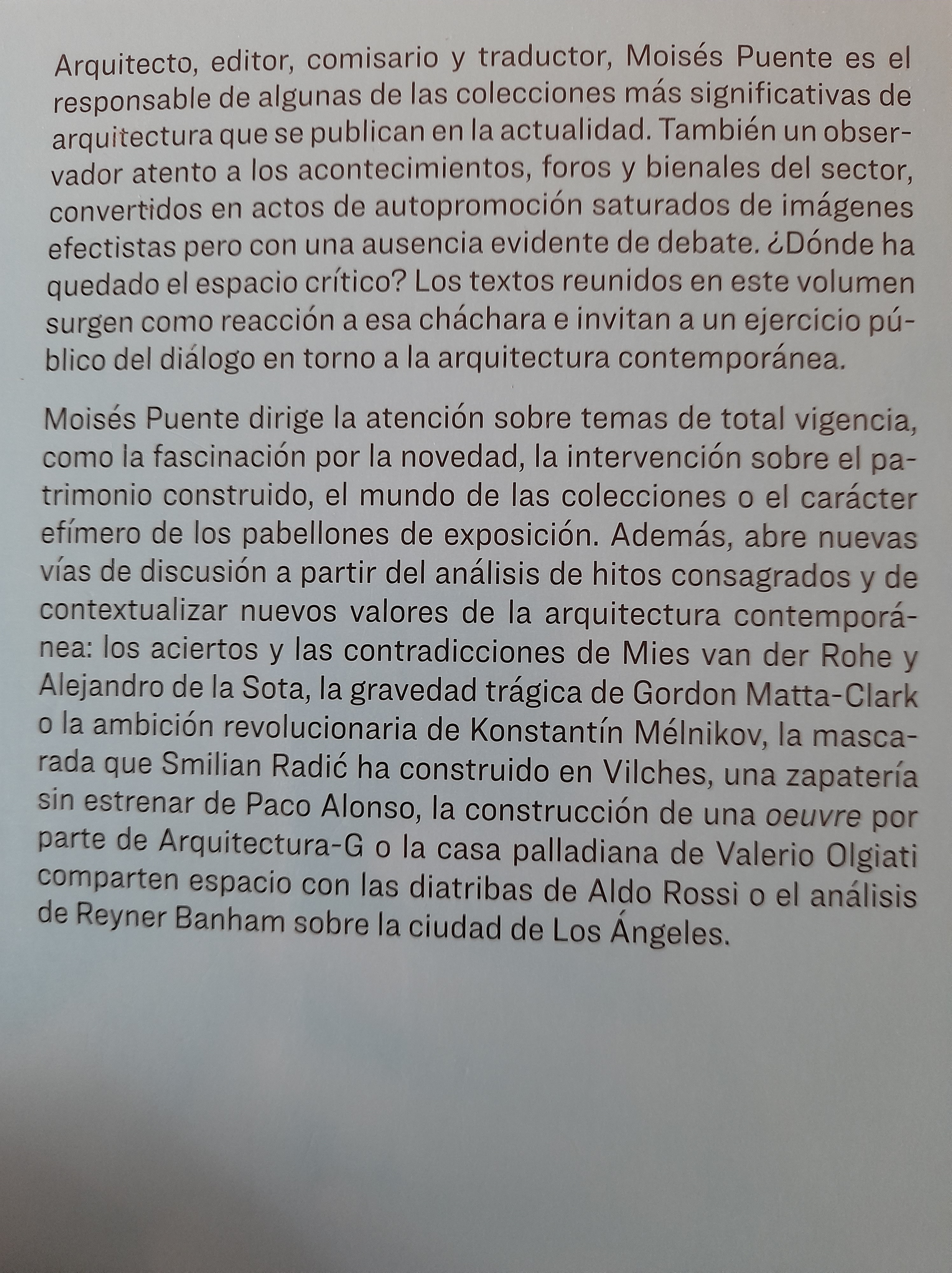 Ideas y nombres se suceden en distintos capítulos en los que Moisés Puente analiza proyectos consagrados unos y prácticamente desapercibidos otros, y la obra de Mies Van der Rohe (la evolución de su pensamiento -y de su obra- hacia el minimalismo) y de Alejandro de la Sota (que otorga a la arquitectura una misión ordenadora del mundo), o las re-vitalizaciones de Lina Bo Bardi comparten páginas con el proyecto de zapatería de Paco Roca, que nunca abrió sus puertas. Reflexiones jugosas sobre el nacimiento del coleccionismo a partir del Descubrimiento de América -en palabras de Philip Bloom-, el nacimiento de las exposiciones industriales a partir de la ferias locales, mercados y fiestas de Carnaval que convergen en el siglo XIX o una mirada sobre el urbanismo, el diseño de la ciudad, con premisas arquitectónicas cuyo referente principal sería Aldo Rossi y su estudio de la ciudad -«La arquitectura de la ciudad»- que lógicamente sería a su vez inspiración para Alejandro de la Sota y su visión física -no sé si decir radicalmente útil- de la arquitectura.